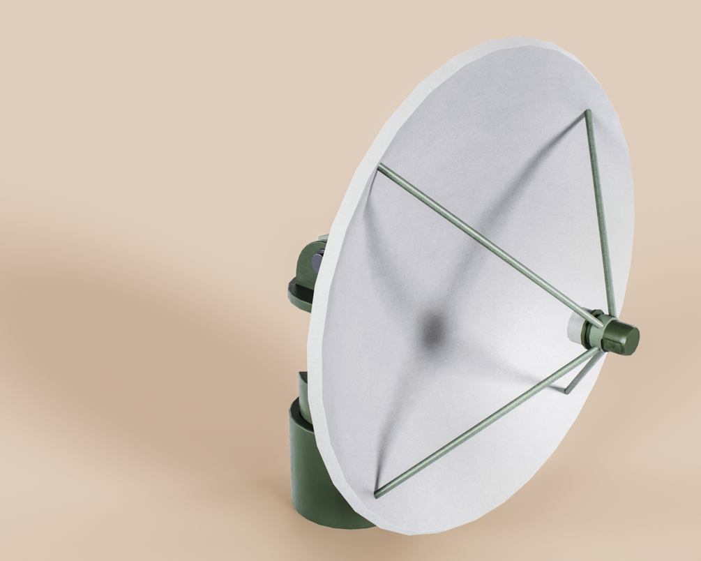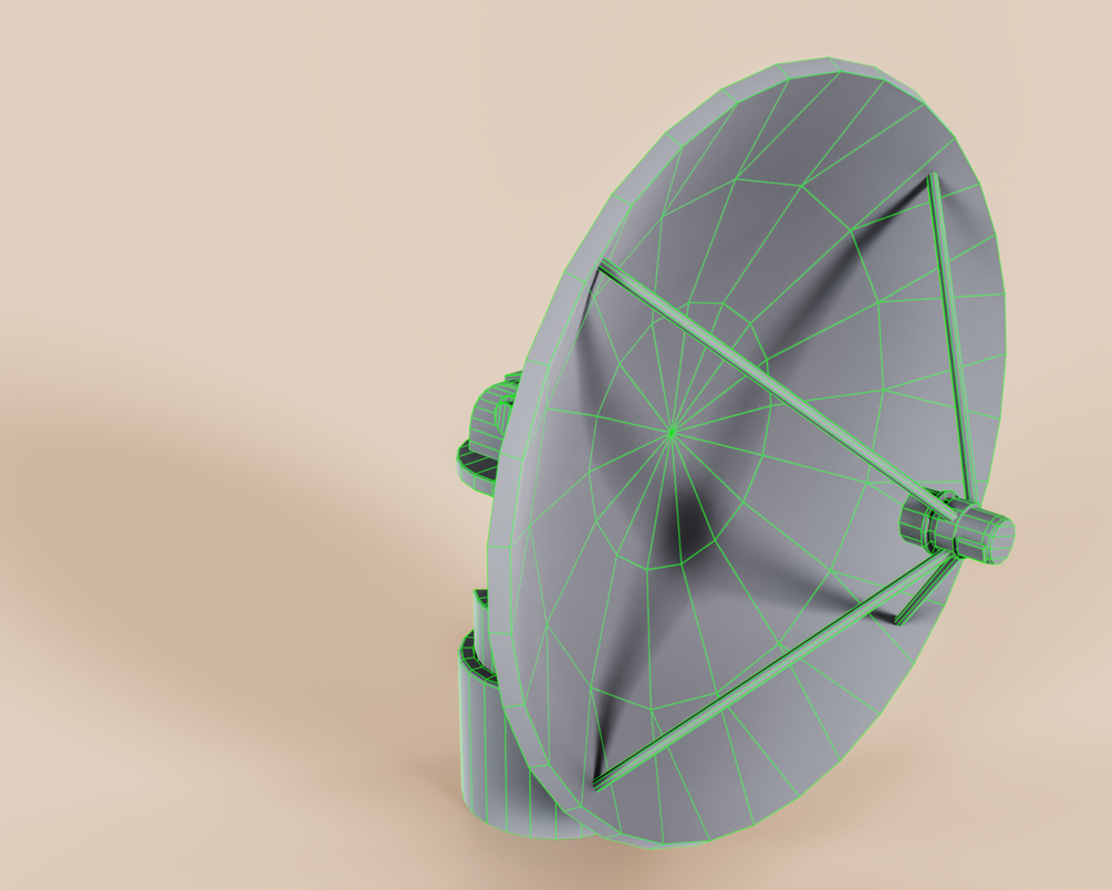 Realistic game-ready low-poly 3D model with clean topology. Composed of 3 moving parts: satellite base, satellite rotator, satellite dish.